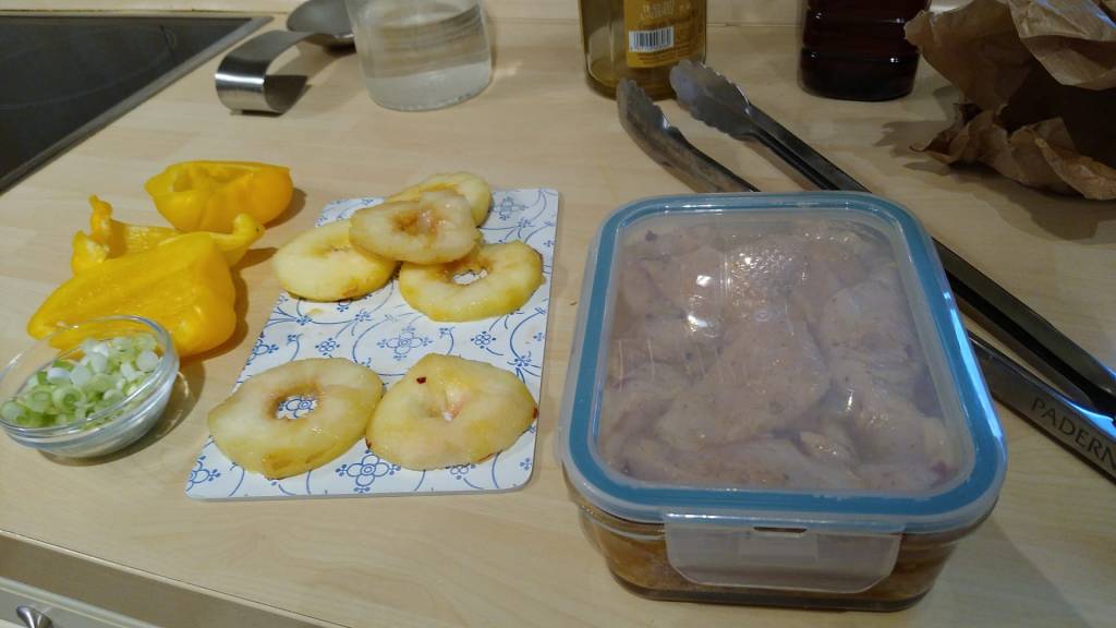 - Cut up grilled fruit and chicken into bite-sized pieces.