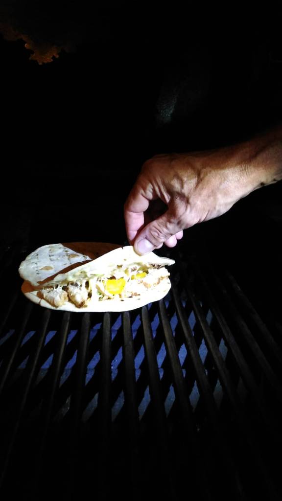 - Place on BBQ (low heat) to grill until cheese is melted and tortilla shell is browned (flipping in between).