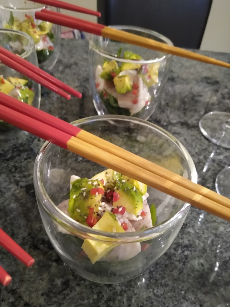 - Assemble in cups or a plate layered with lettuce (drizzled with a bit of soya sauce), fish pieces, avocado, sprinkled with the small chili pieces, sesame oil, and seeds