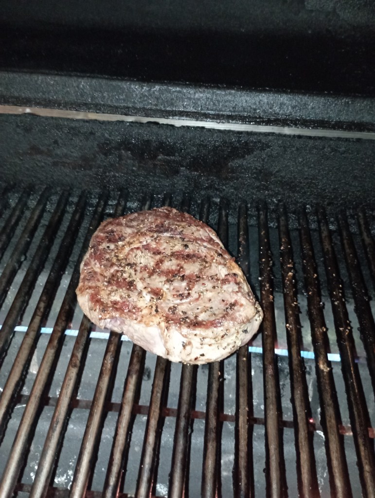 - When you‘re about 25 minutes away from wanting to eat, fire up the grill on highest heat and let it reach max. safe temperature. If you do have a sizzle zone, you can start 5 minutes later. Once the grill is hot, drop the steak on and let is sit for a few minutes with the lid up or wedged so it is searing, not baking. If it’s really thick, I sear the edges a bit first to lock in the juices. Once you have a nice sear on the one side (you can rotate it 45 degrees after a few minutes to get nice crosshatch grill marks on it if you want) turn the heat down to low and flip the steak. A sign it’s time to flip is when blood starts to appear on the top.