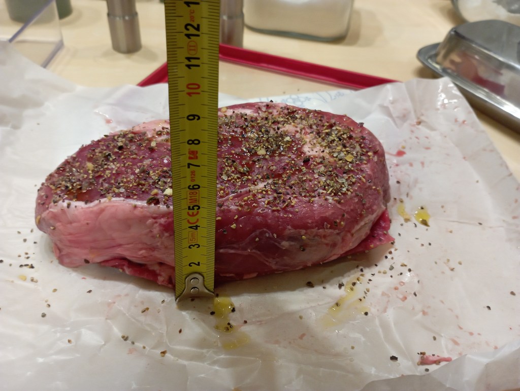 Since I’ve generally been making steak for just Heather and I, and we both like it medium rare (pink to red in the middle), I just buy one nice thick steak for us both and give her the „Edelstück“ (precious gem piece). I find cooking a steak that is thinner than an inch is much harder and more prone to being overdone. If it’s just for you, a couple of extra slices on a sandwich or with your eggs the next day isn‘t then end of the world—go big or stay home!