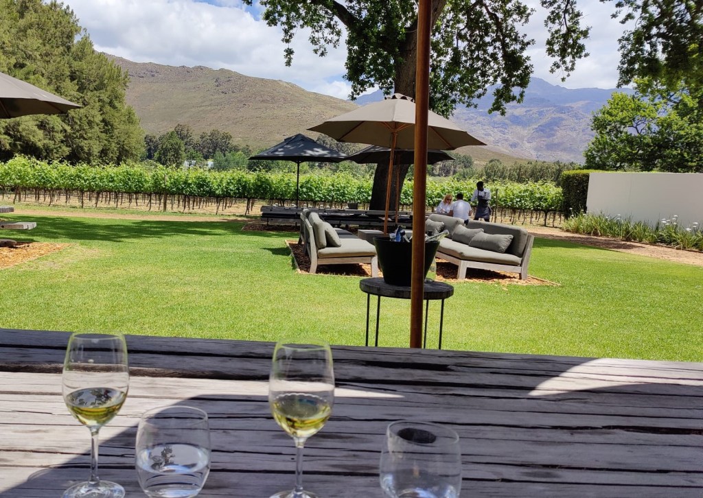 We were seated outside on their terrace, facing a panoramic view of sweeping hills, vineyards, mountains, springboks, wildebeests and zebras! For the next hour we tasted their wines, each presented by the host with intriguing information and vineyard history. The sun was shining, there was a gentle breeze, and one of the owner’s dogs perched himself up on the ledge and watched over us. All of this before noon! At least there was another couple at a table beside us also engaging in this hedonistic act.