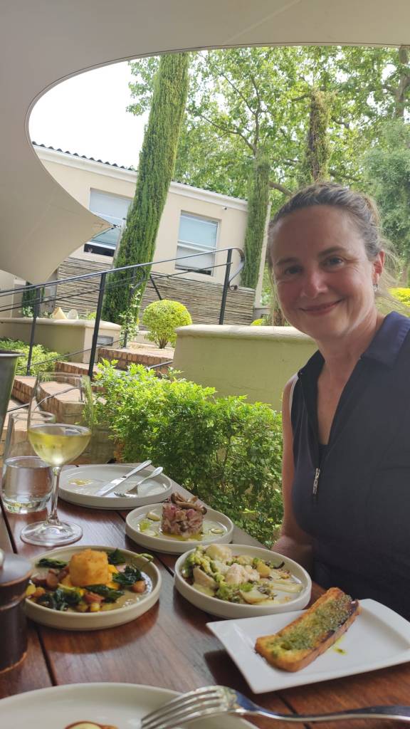 We planned to tour and lunch in the hills of Franshhoek. I researched restaurants ahead of time and decided on the Chefs Warehouse at Maison as I liked their philosophy of using local farm ingredients. We were seated outside in their garden at a long rustic picnic table with more views of vines.