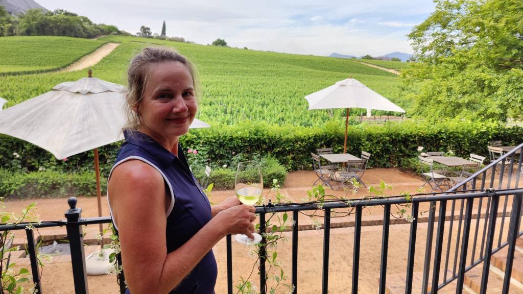 My birthday was spent golfing at Paarl Golf Club where we paired up with a nice German couple living in Norway followed by a late lunch at Stoep, located on the Laborie Estate where we sat on a patio overlooking their hillside vineyard. It was a sweltering day and the misting cool water from above our table was welcomed. It was my very first birthday wearing a sleeveless dress and dining al fresco.