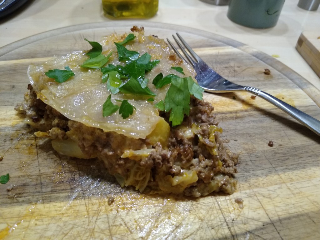 The recipe below was inspired by this one I came across on my friend’s Pinterest: Lasagne mit Wirsing, Hackfleisch und Kartoffeln (Lasagna with Savoy Cabbage, Ground Beef, and Potatoes). Since I had made Hearty Cold-Weather Cabbage Rolls just the week before, I wanted to make something different with the leftover cabbage.