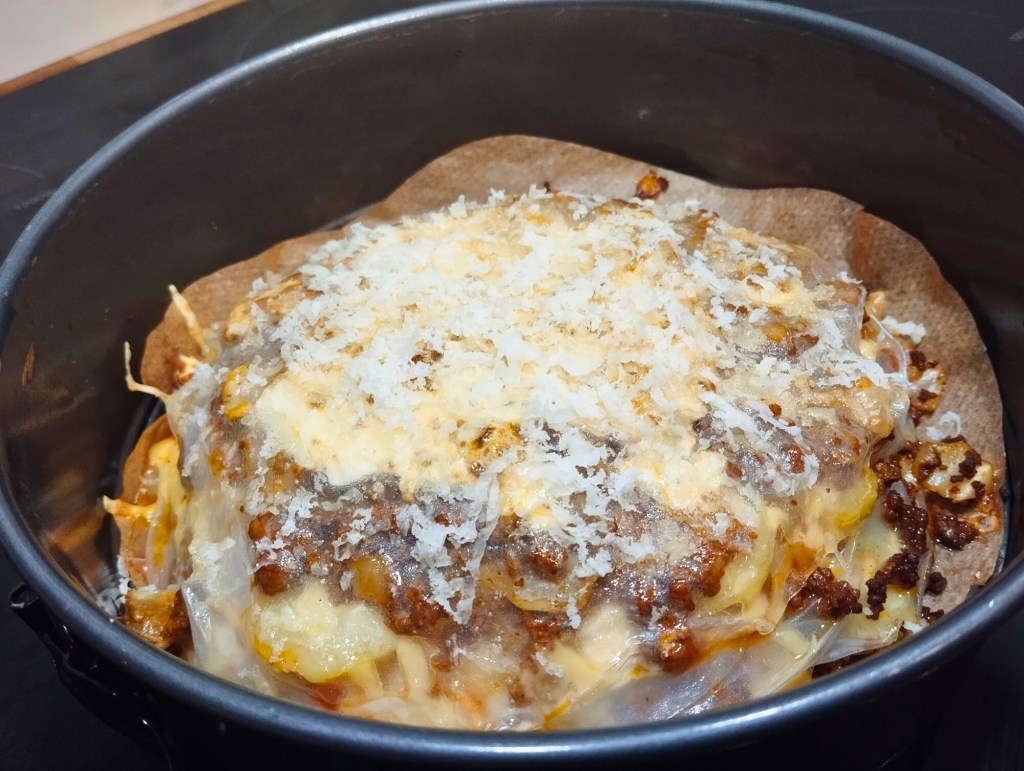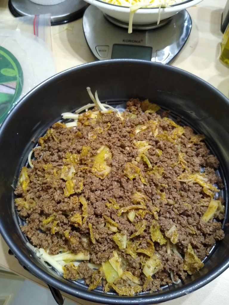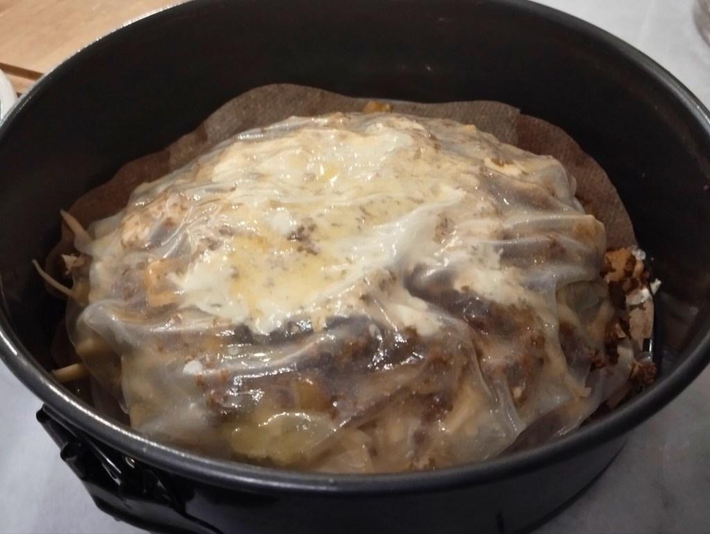 I liked the ingredient combination in the found lasagna recipe, but I made substitutions such as using rice paper as layers instead of lasagna noodles (they are the perfect size for a springform pan), sour cream instead of Béchamelsauce, and added beef stock to the ground beef mix for more moisture (chicken stock can be used as well). I also used less cheese.