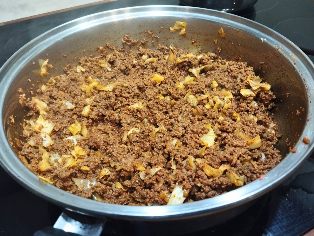 - While potatoes are cooking, heat olive oil in a frying pan. Add ground beef and brown. Add garlic, cabbage, paprika, and cumin, and sauté until fragrant. Then add beef (or chicken) stock and cook for about 10 minutes until the stock is absorbed. Check and add salt/pepper. Remove pan from heat.