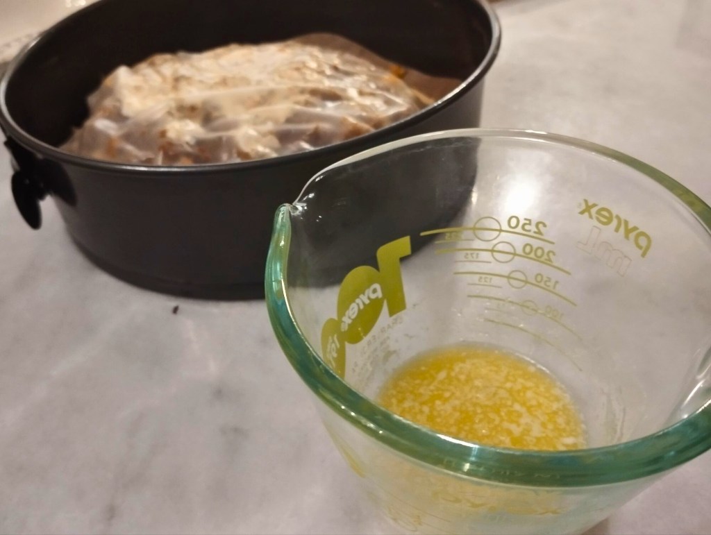 When I first published this recipe, I used heavy cream and found it leaked through the springform pan. This time, I added baking paper to the bottom and used sour cream with some Crème fraîche, but found the sour cream spread more easily. It held together perfectly. (Note, some of the pics below are from the original publication and don’t include the baking paper.)