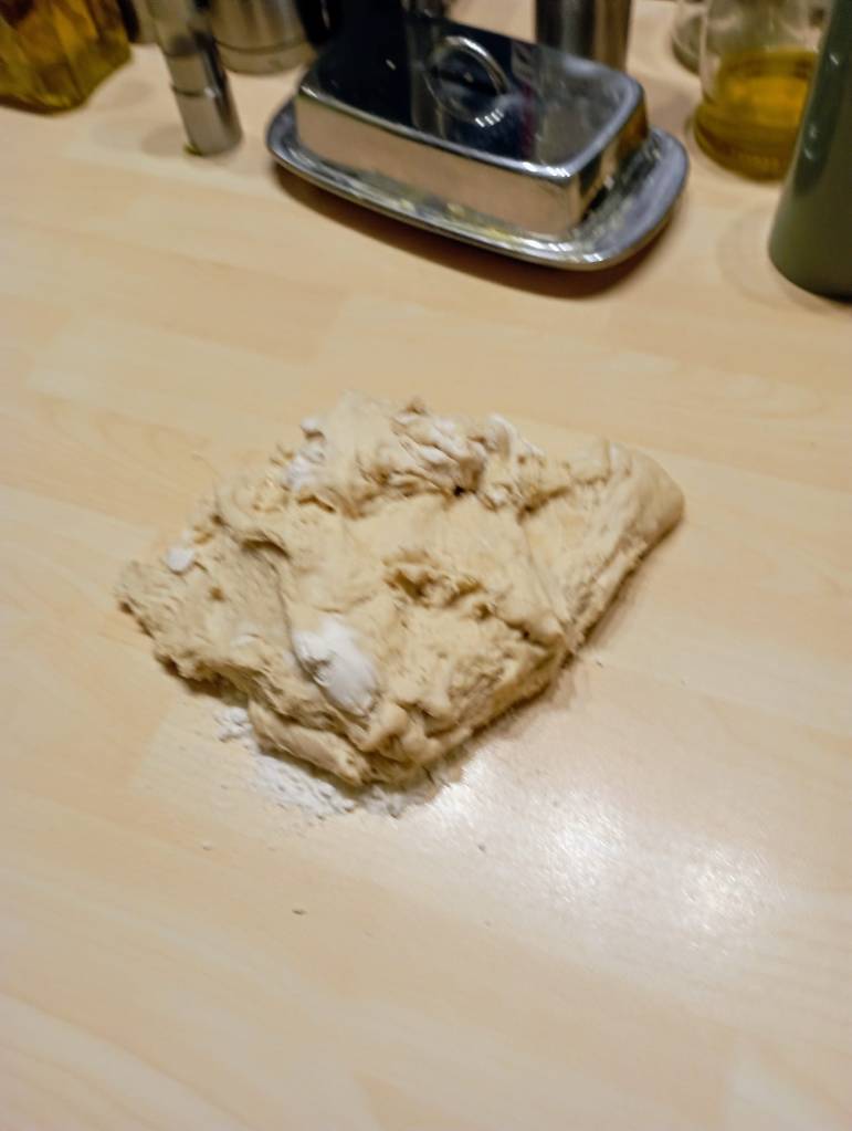 - Sprinkle flour on your counter, flop down dough and knead. Add flour if too dry until it doesn’t stick to your fingers anymore.