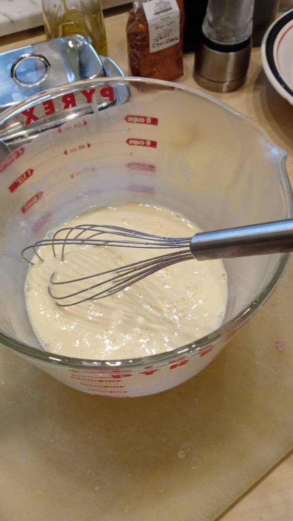 - Mix the eggs and cream. Add a dash of tabasco. Pour mixture over bread and ham.