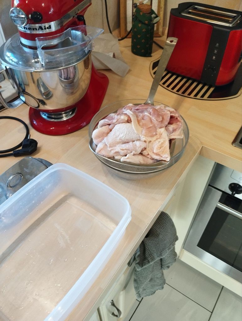 - Drain and discard brine from chicken. Rinse off thighs and pat dry with paper towels.