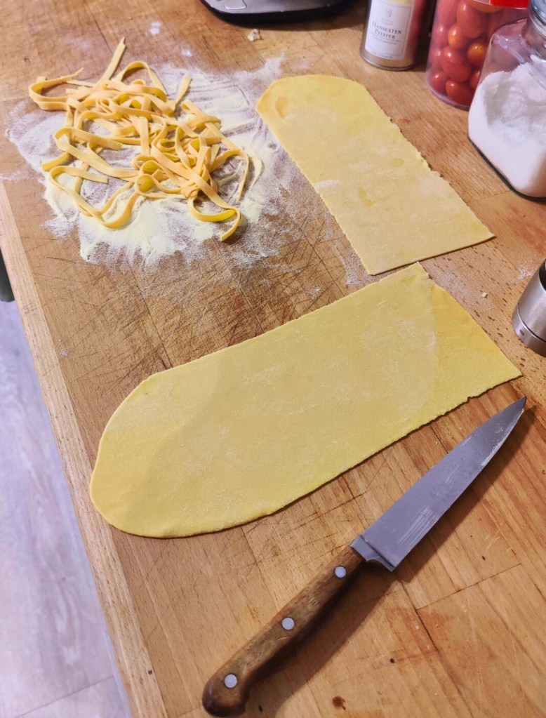- If you don’t have a pasta maker, roll out the dough with a rolling pin, dusting with flour as necessary to keep it from being sticky.