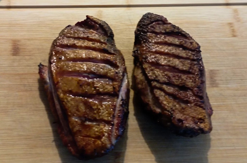 - Place the duck breasts on the grill, fat side up, and sear directly over the coals until browned (lid off, about six minutes).